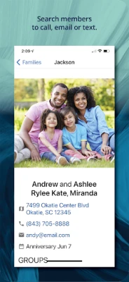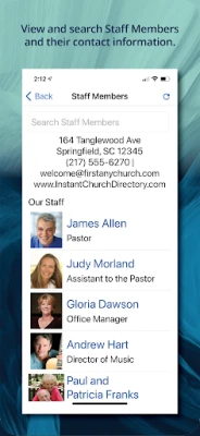 Use Instant Church Directory to: * View family information and photos just like any traditional paper directory. * Search members to call, email, or text. * Click on member's address to launch your default map app. * View and search Staff Members and their contact information. * View members listed by groups. * View birthdays listed by month.