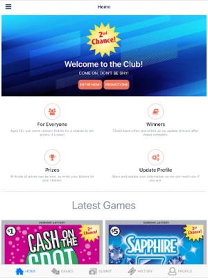 This is the official 2nd Chance app from Vermont Lottery! This app allows you to view information about eligible instant games, 2nd Chance drawings, and 2nd Chance drawing winners. You can also scan your instant tickets and draw-based jackpot game tickets such as Powerball® and Mega Millions®, etc. to preview your winnings and enter non-winning instant tickets into 2nd Chance drawings.